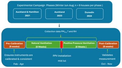 Nghiên cứu được thực hiện tại 24 hộ gia đình không hút thuốc và không nuôi thú cưng, phân bố tại các thành phố Auckland, Hamilton và Dunedin của New Zealand. Các ngôi nhà được lựa chọn đều là nhà đứng độc lập, có từ ba đến năm phòng ngủ với diện tích sàn thay đổi từ 80 mét vuông đến 270 mét vuông và có từ hai đến năm người ở. Chiến dịch thực địa bao gồm ba giai đoạn riêng biệt vào các năm 2021, 2023 và 2024, diễn ra trong suốt ba tháng mùa đông với sáu tuần giám sát trước và sáu tuần sau khi lắp đặt hệ thống thông gió áp suất dương. Mỗi ngôi nhà được trang bị ba thiết bị giám sát chất lượng không khí đặt tại phòng ngủ chính, khu vực sinh hoạt và ngoài trời để ghi lại nồng độ PM2.5, nhiệt độ và độ ẩm tương đối liên tục. Ba loại thiết bị giám sát khác nhau đã được sử dụng bao gồm Airly PM, uRAD và EdiGreen Home AI-2002 W. Tất cả các cảm biến phục vụ nghiên cứu đều được hiệu chuẩn bằng cách sử dụng các trạm giám sát chất lượng không khí của hội đồng thành phố làm thiết bị tham chiếu tiêu chuẩn trước và sau mỗi giai đoạn giám sát. Quy trình hiệu chuẩn này được thực hiện hàng giờ tại khuôn viên Viện Công nghệ Unitec bằng cách đặt cùng với các cảm biến hiệu chuẩn bao gồm máy Aeroqual Dust Sentry Pro đã được chứng nhận. Dữ liệu sau đó được xử lý để loại bỏ các điểm dị biệt và phân tích thống kê bằng phần mềm R. Một mô hình hồi quy tác động hỗn hợp tuyến tính đã được phát triển để đánh giá sự thay đổi nồng độ PM2.5 trong nhà trong khi kiểm soát các yếu tố nồng độ ngoài trời, nhiệt độ ngoài trời, diện tích nhà và công suất cấp khí chuẩn hóa. Các phép kiểm định Mann-Whitney U và tương quan hạng Spearman được sử dụng để đánh giá ý nghĩa thống kê và sức mạnh của các thay đổi quan sát được.