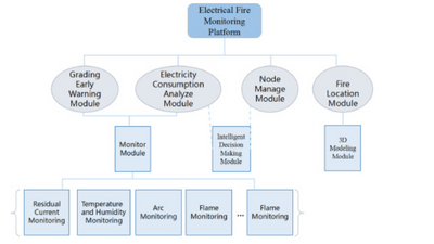 Hệ thống giám sát cháy điện thông minh này áp dụng công nghệ IoT cho phép các thiết bị giám sát điện kết nối và giao tiếp trong tòa nhà, thu thập và lưu trữ dữ liệu kinh doanh thông qua công nghệ truyền thông mạng. Hệ thống sử dụng kiến trúc EC-IOT với thiết kế phân lớp gồm “đám mây, cạnh và thiết bị đầu cuối”. Để đảm bảo cảnh báo sớm có độ trễ thấp, các nút cạnh được triển khai phân phối tinh vi theo từng tầng của tòa nhà, giúp giảm thiểu độ trễ do truyền dữ liệu qua mạng và tăng cường khả năng phản ứng nhanh của hệ thống. Cảm biến của hệ thống bao gồm cảm biến nhiệt độ, khói, nguồn cháy, dòng điện và điện áp, cảm biến dòng dư và cảm biến hồ quang, giúp phát hiện kịp thời nguy cơ cháy điện và đưa ra cảnh báo hiệu quả.
